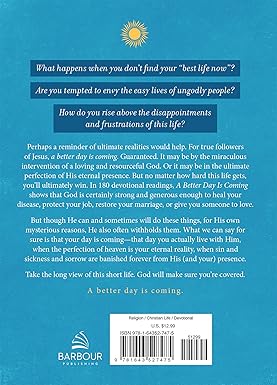 It may be by the miraculous intervention of a loving and resourceful God. Or it may be in the ultimate perfection of His eternal presence. But no matter how hard this life gets, you’ll ultimately win. In 180 devotional readings, A Better Day Is Coming shows that God is certainly strong and generous enough to heal your disease, protect your job, restore your marriage, or give you someone to love.