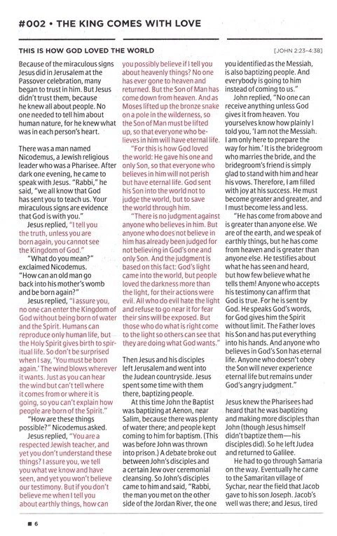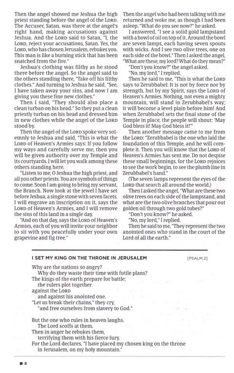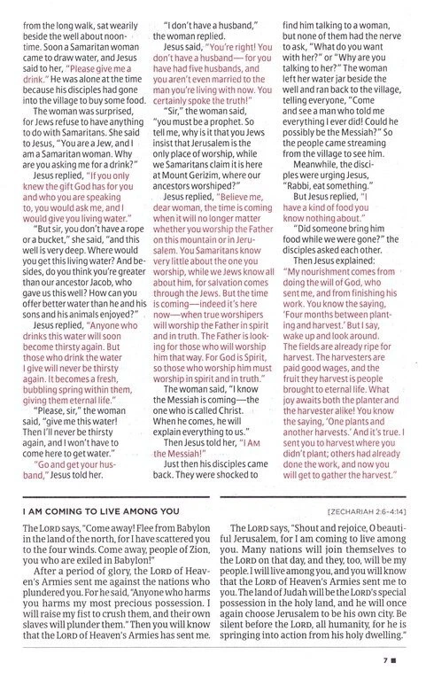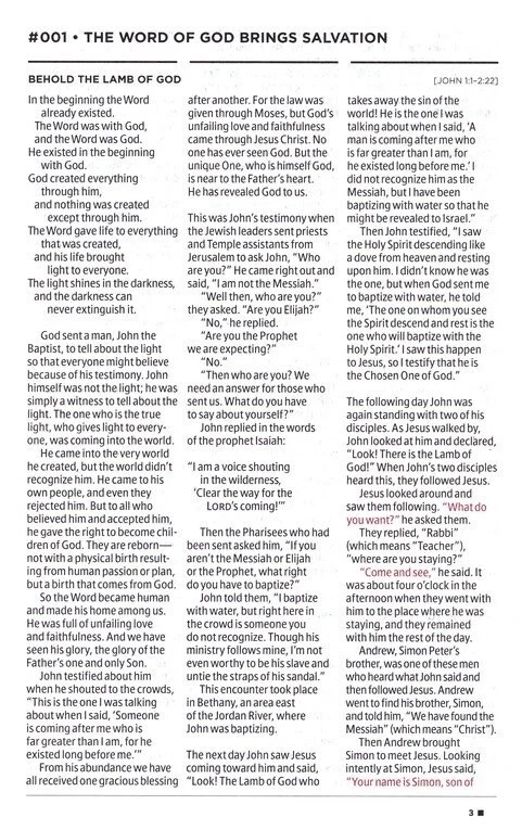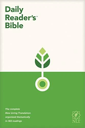 The Daily Reader’s Bible offers the promise of reading the entire Bible in one year. But rather than providing a canonical progression through the Old Testament, the New Testament, Psalms and Proverbs, each day’s reading includes three passages–one selected from the Stories of the Bible, another from the Teachings of the Bible, and the final passage selected from the Wisdom of the Bible. The three readings for each day flow from the day’s theme. This thematic approach to devotional Bible reading helps the reader understand how all the genres of Scripture fit together to convey God’s truth.The innovative interior design gives the reader visual cues for which of the three Scripture types they are reading through layout and font selection. The Story is presented in a three-column format in sans-serif font. The Teachings are presented in a two-column setting in a serif font. Wisdom is presented in a one-column setting to preserve the feel of the poetic passages. See the beautiful thematic connections of God’s story throughout the new Daily Reader’s Bible . For the first time, you can discover these links as part of your daily devotional and Bible reading. EASY: The entire text of the Bible is uniquely arranged for daily reading that can be completed in as little as 15 minutes per day. Each daily reading is numbered, so you can start anytime. FRESH: The Daily Reader’s Bible will help you understand the connections between the Story, Teaching, and Wisdom portions of Scripture. CLEAR: The NLT is the trusted Bible translation you can most comfortably read, understand, and actively apply to your life.