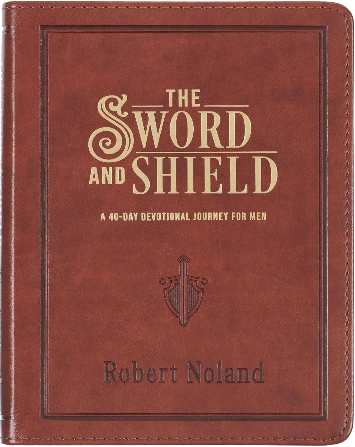 The saddle tan faux leather devotional’s front cover features a heat-debossed sword and shield combo design. The title and subtitle are presented in gold-foiled lettering.
